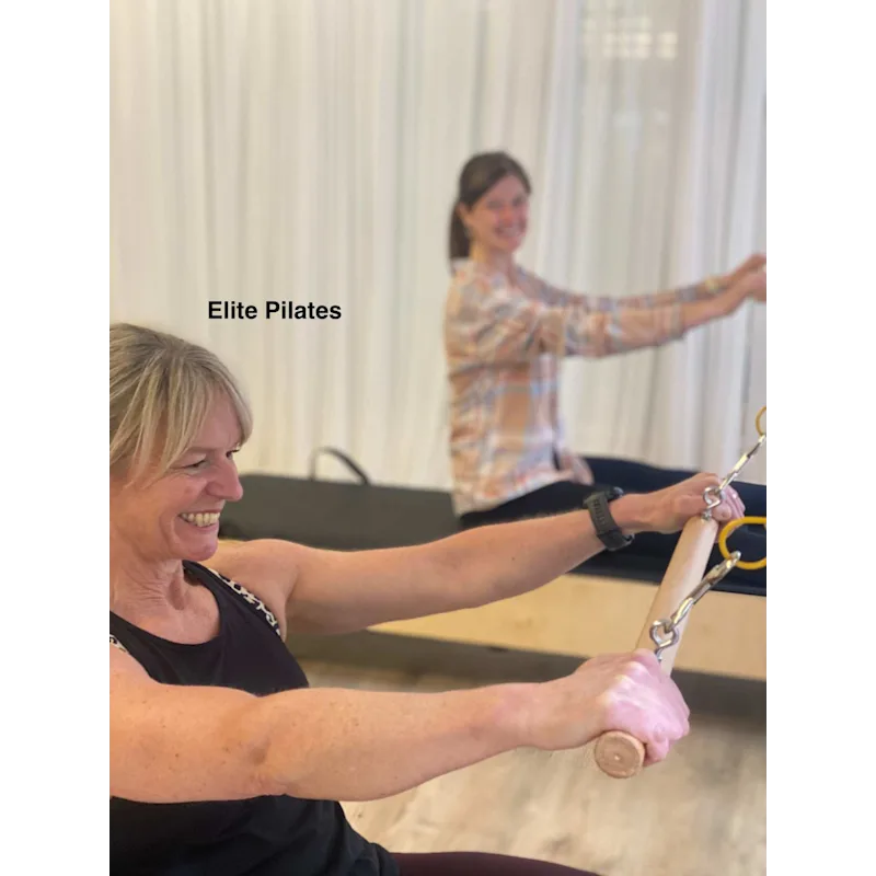 `Coming Soon to Bodmin – Elite Pilates Reformer Classes; Pilates on the reformer machine. Elite’s reformers also have the Tower. That is attached to each reformer is a half Cadillac, sometimes called a Half trapeze. We just refer to it as the Reformer Tower. Hopefully you will give us a try – we focus on fun, we do hands-on correction where needed.